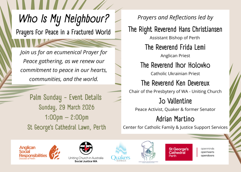 The Anglican Social Responsibilities Commission (SRC) will again host an ecumenical Palm Sunday Prayers for Peace gathering on Sunday 29 March. This event is supported by the Uniting Church WA Social Justice Commission alongside other ecumenical groups with speakers on the day including Rev Ken Devereux, Chairperson of the Uniting Church Presbytery of WA.