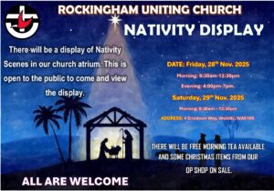 There will be a display of over fifty Nativity displays in our Church Hall. There will be free morning tea and some Christmas items from our OpShop on sale.