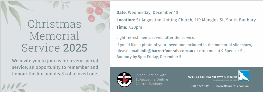 If you’d like a photo of your loved one included in the memorial slideshow, please email one to [email protected] or take it to 9 Spencer St, Bunbury by 5.00pm Friday, 5 December.