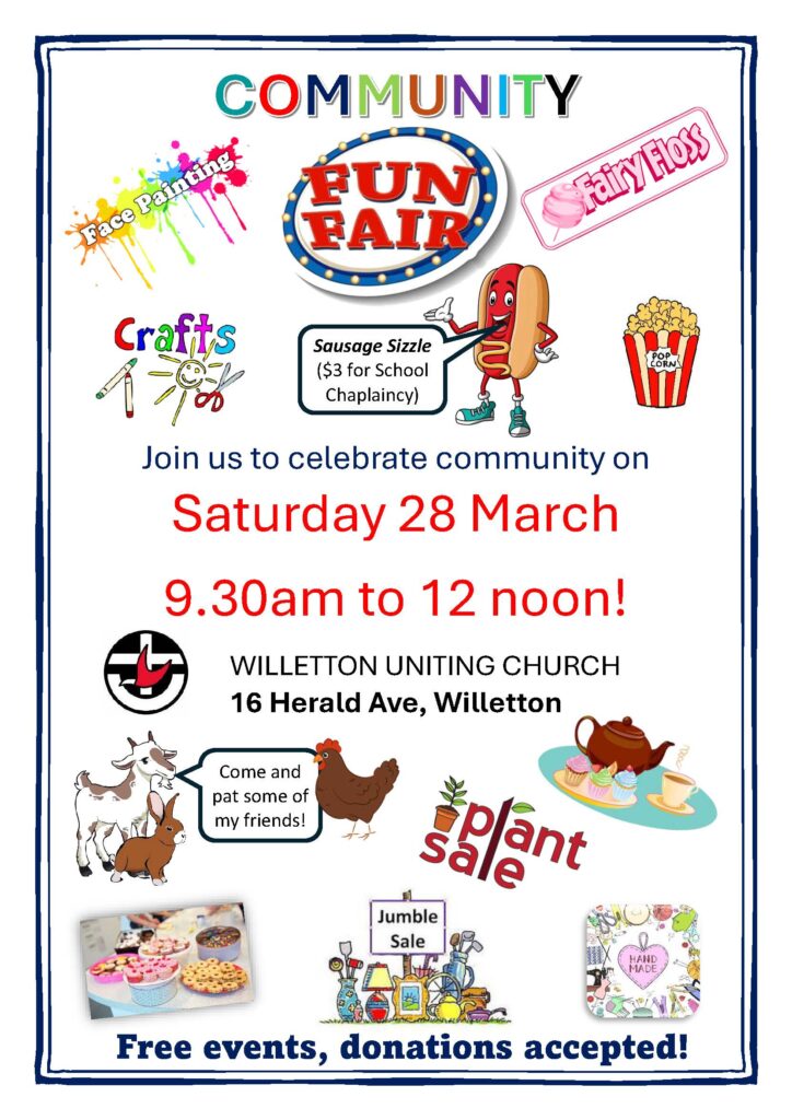 Willetton Uniting Church invites you to join them in celebrating community at their Community Fun Fair on Saturday 28 March, 9.30am to 12.00pm.