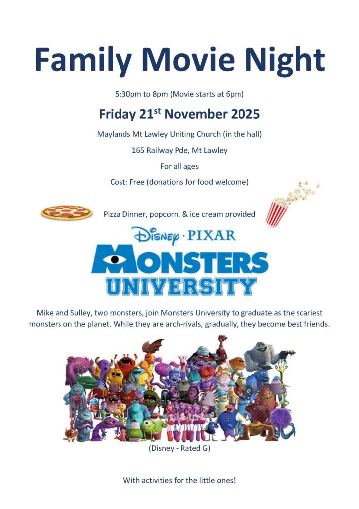 Maylands – Mt Lawley Uniting Church invites you to a Family Movie Night on Friday 21 November starting at 5.30pm. The movie will be the Disney Pixar film Monsters University, and there will be a pizza dinner, popcorn and icecream provided. Cost is free (donations for food welcome).
