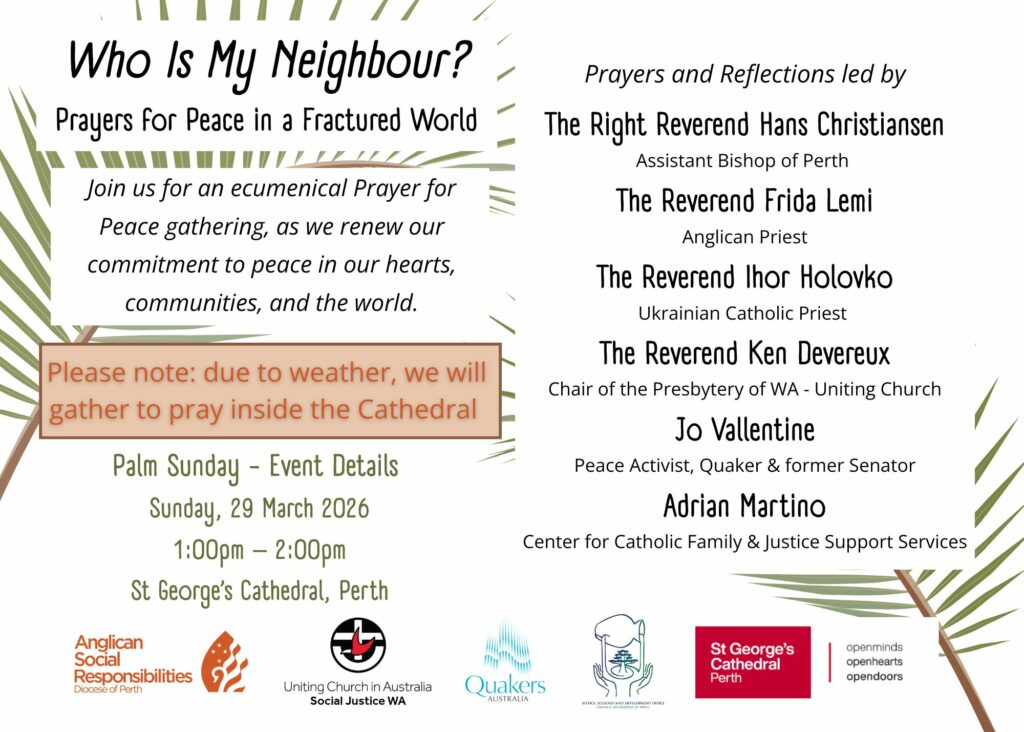 The Anglican Social Responsibilities Commission (SRC) will again host an ecumenical Palm Sunday Prayers for Peace gathering on Sunday 29 March. This event is supported by the Uniting Church WA Social Justice Commission alongside other ecumenical groups with speakers on the day including Rev Ken Devereux, Chairperson of the Uniting Church Presbytery of WA.