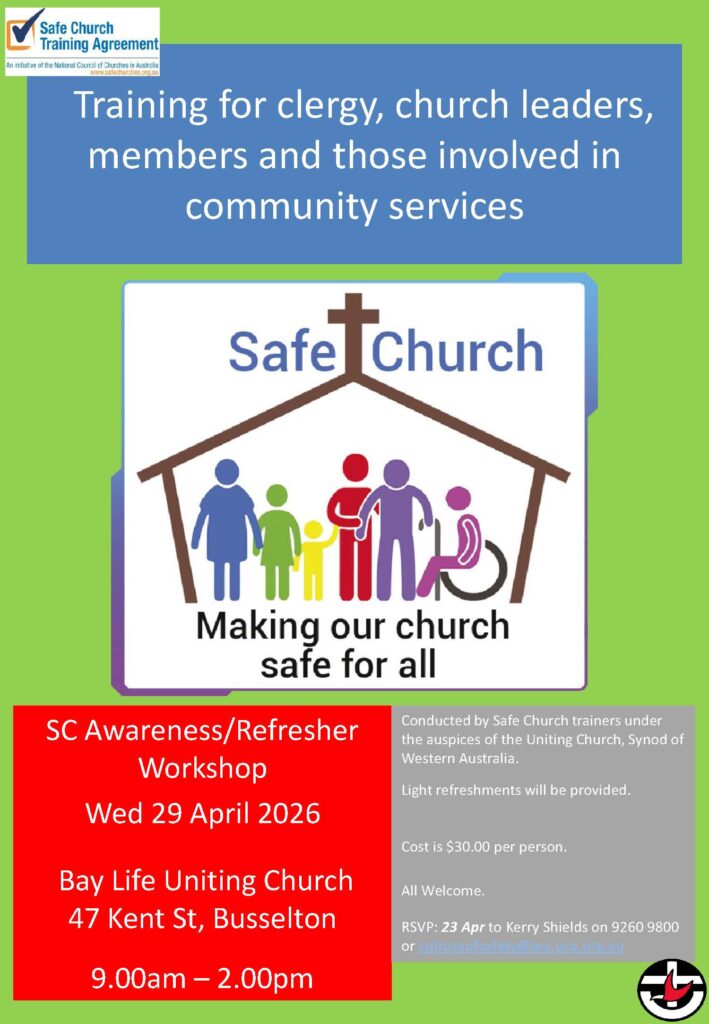 There will be a Safe Church Awareness/Refresher Workshop taking place on Wednesday 29 April from 9.00am to 2.00pm at Bay Life Uniting Church, 47 Kent St, Busselton, WA.