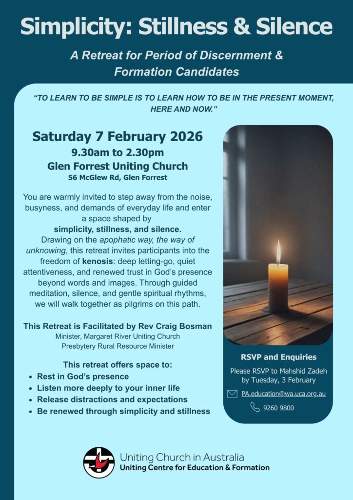 This Retreat is Facilitated by Rev Craig Bosman, Minister at Margaret River Uniting Church and Presbytery Rural Resource Minister.