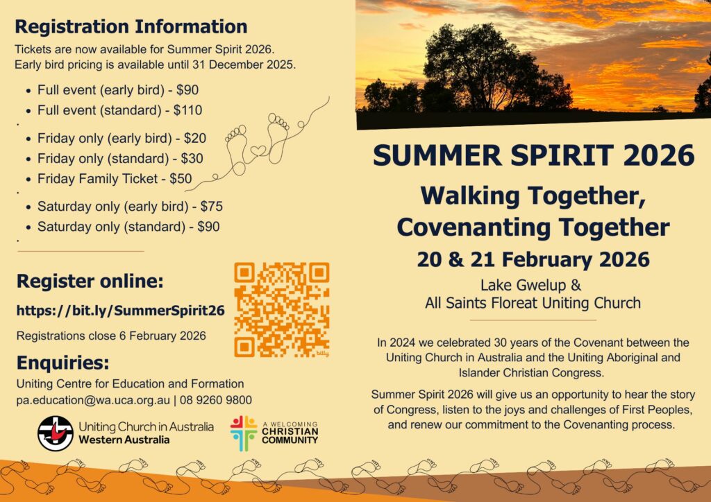 Go to our Eventbrite site to register – https://www.eventbrite.com.au/e/summer-spirit-2026-walking-together-covenanting-together-tickets-1962978502543