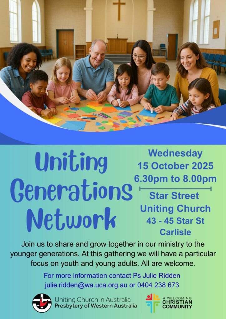 The next Uniting Generations Network gathering is on Wednesday 15 October from 6.30pm to 8.00pm at Star Street Uniting Church in Carlisle.