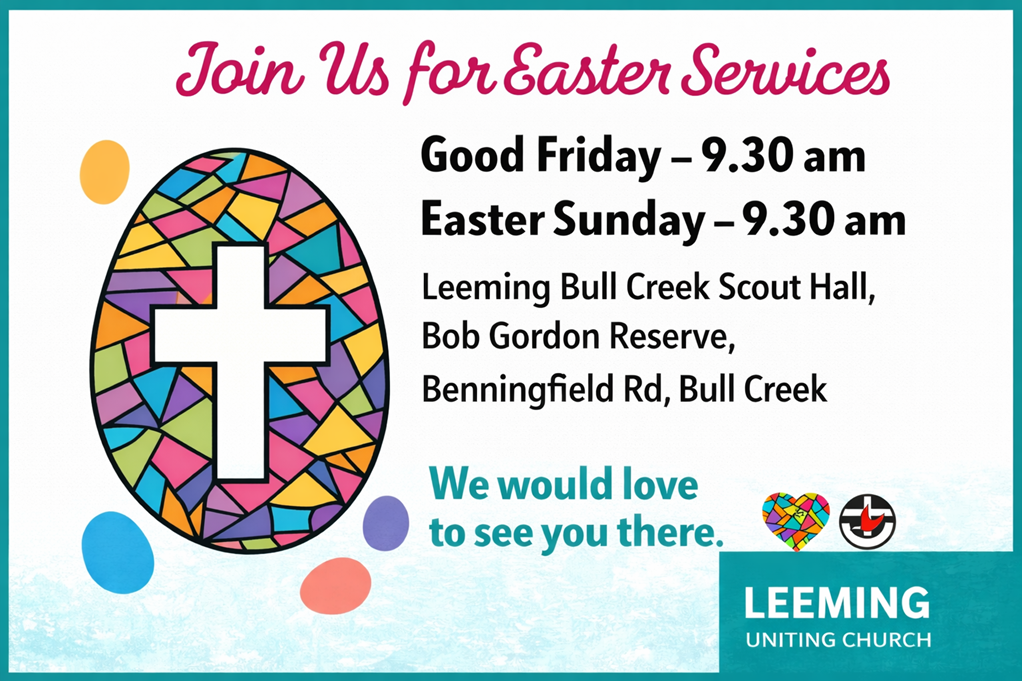 Join us at Bicton Uniting Church for our Good Friday service on 3 April starting at 9.30am. Our service will be led by Bob Gregory.