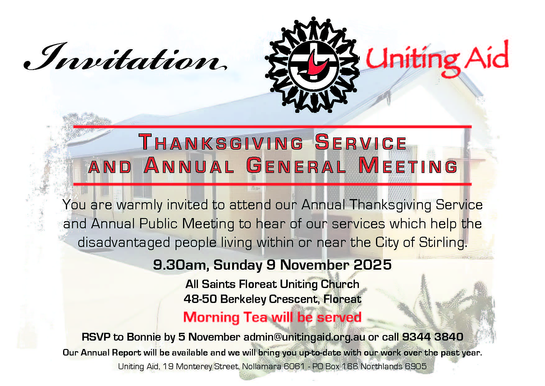 You are warmly invited to attend the Uniting Aid​​​​​​​ Thanksgiving Service and Annual Public Meeting held in conjunction with a Thanksgiving Service, on Sunday, 9 November 2025, at 9:30 am, at All Saints Floreat Uniting Church.