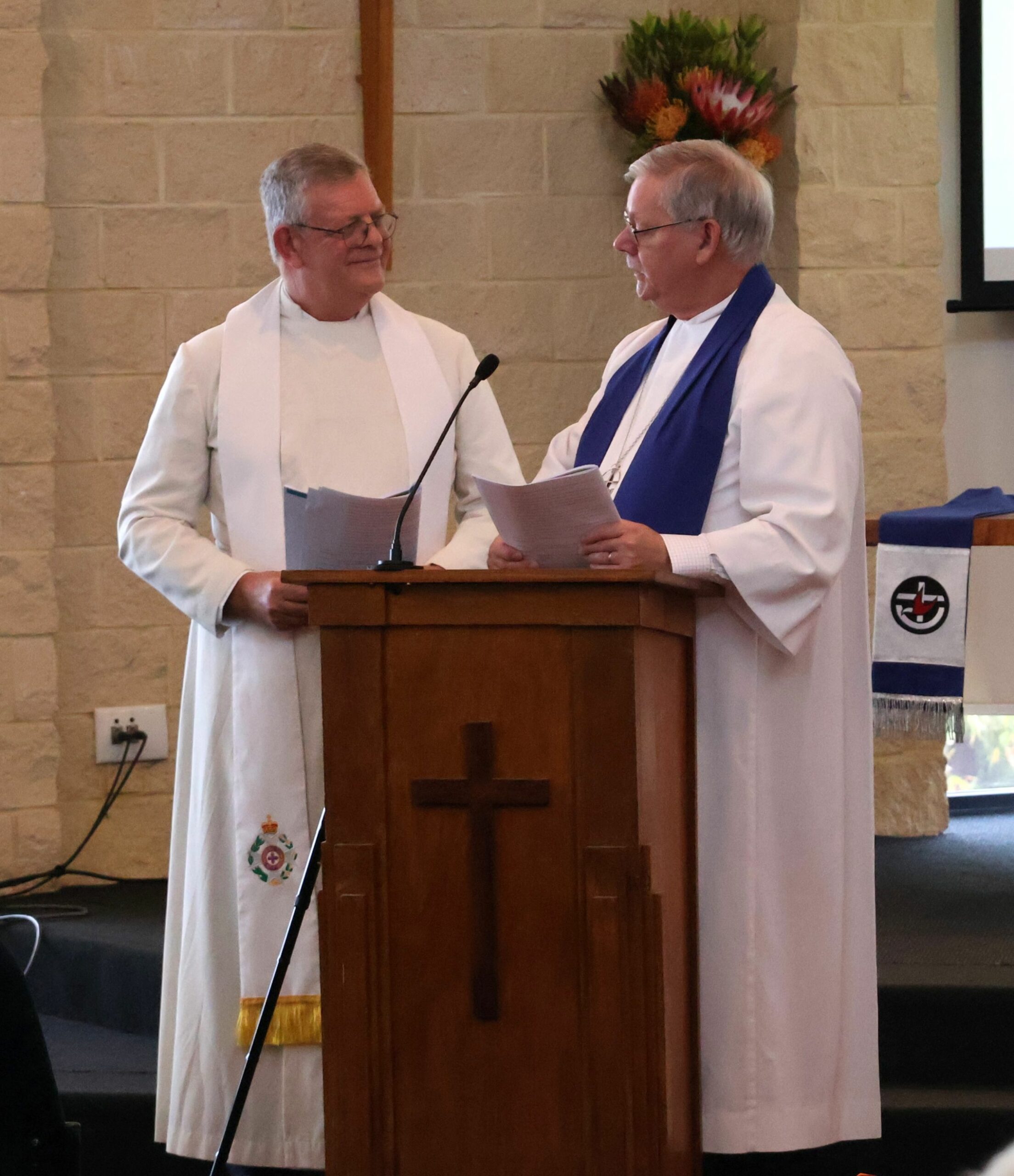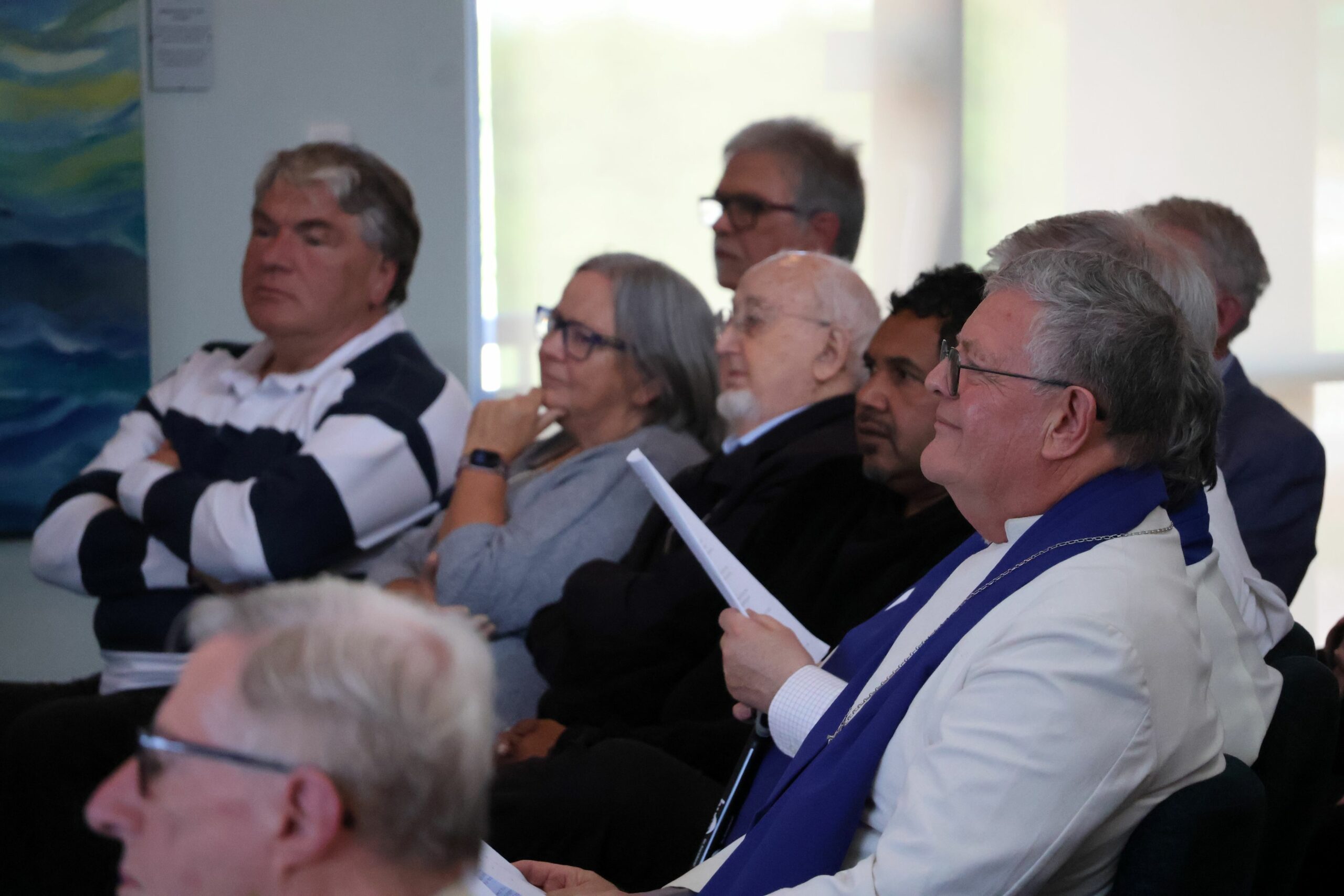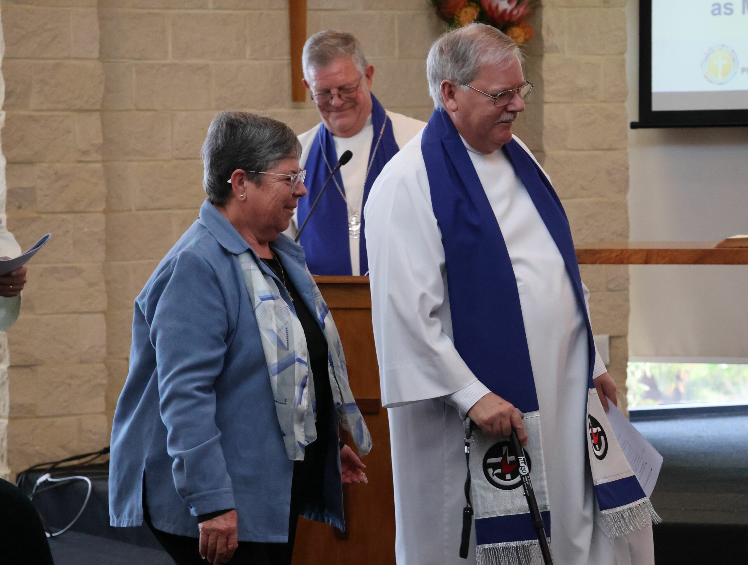 Following the laying of hands and prayer, David was presented with the Moderator’s symbols of office. These included the Scarf, as a sign of the office, the Staff which has been passed from Moderator to Moderator since 1993 as a reminder of the pastoral dimension of the role, and the Pendant, a silver stylised UCA emblem worn as a symbol of the role. Finally the Synod Bible was signed, as previous Moderators have done.