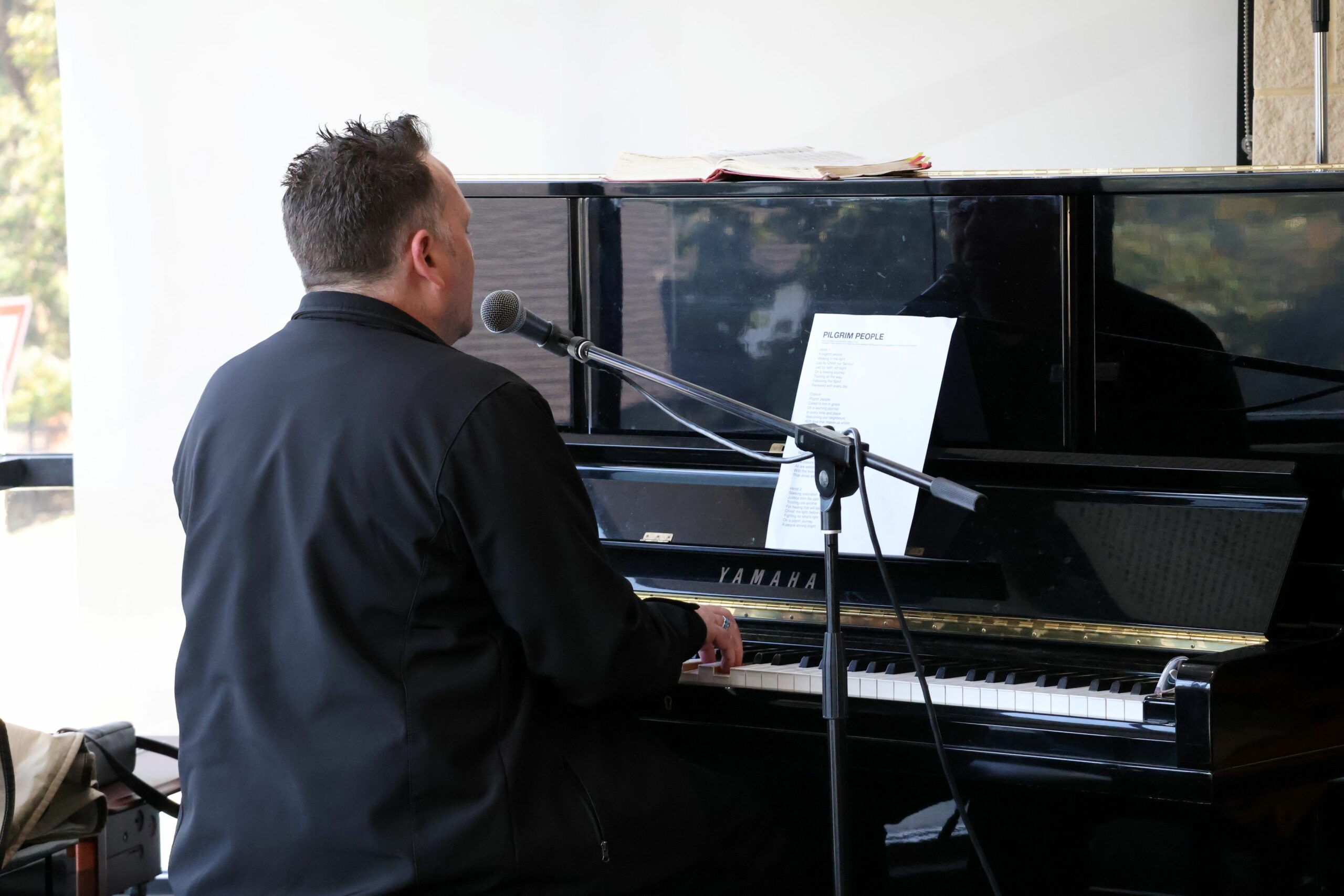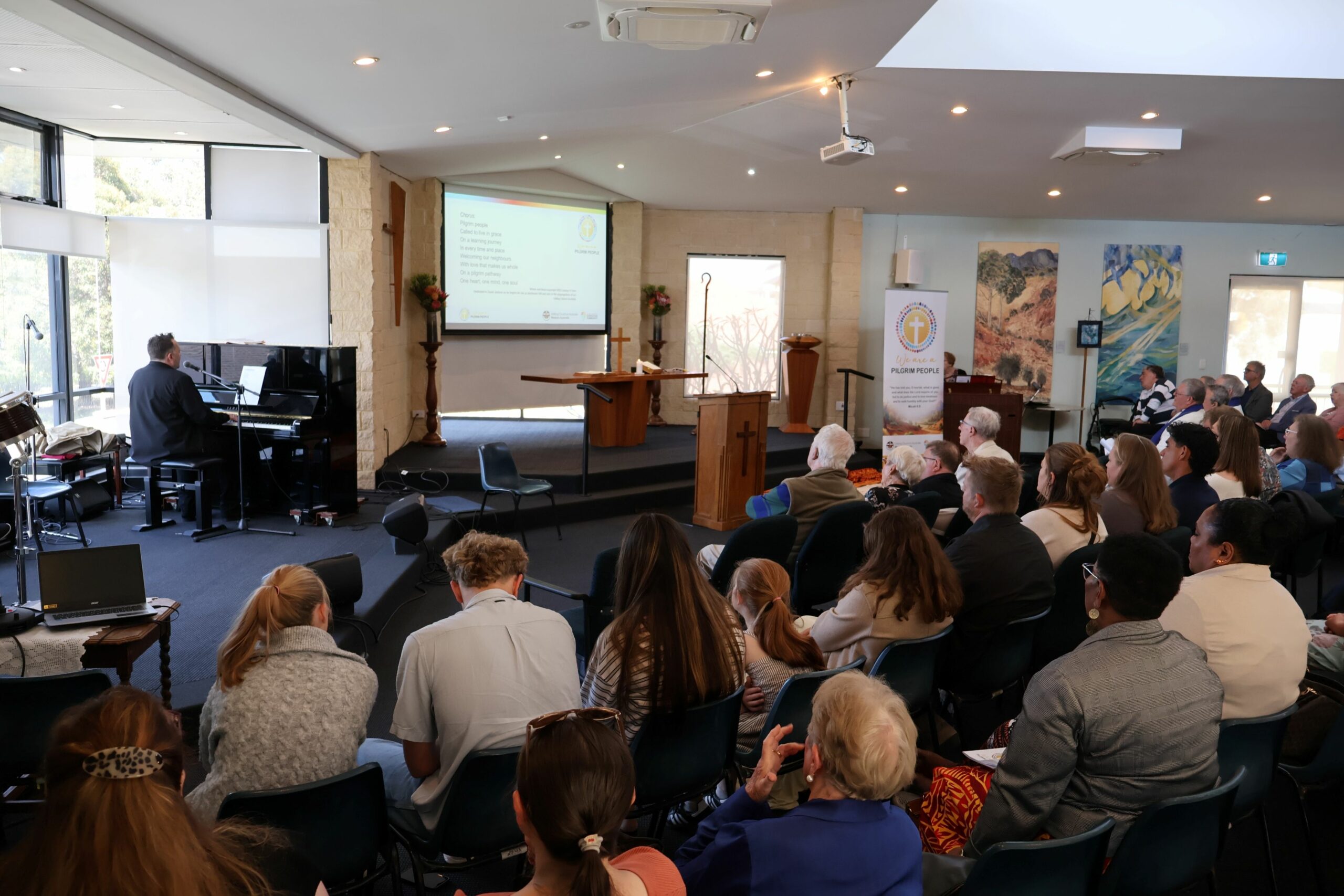 Following the sermon, Pastor Lindsay Ginn, Frontier Services Bush Chaplain in the Goldfields, performed a song written as a theme for the Moderator’s term, ‘Pilgrim People’. The congregation were invited to join in with the words shared on the screen.